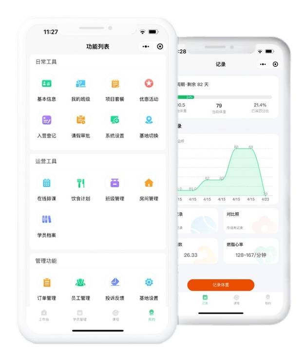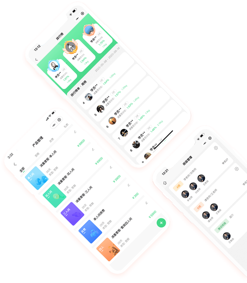 我们提供独立的小程序上架可自定义logo和名称,更好地实现品牌化和个性化,让你的减肥训练营在市场上更具竞争力和影响力。我们的小程序具备智能排课、班级管理、职工管理、体重记录、饮食计划、财务管理、房间管理、活动营销等多项功能,满足你的所有需求。通过我们的小程序,让你的训练营更加专业、高效、人性化,快来试试吧!