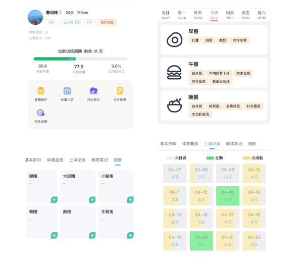 详细的数据:打卡率、课程签到率、体脂达标率、课程评价、教练评价